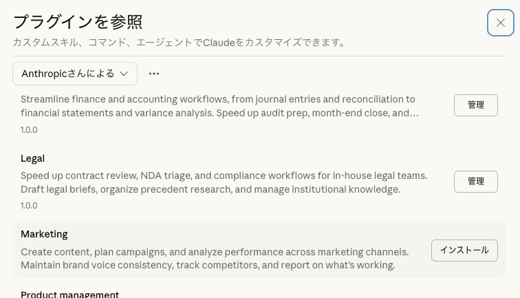 Coworkの大きな特徴はプラグインによる機能拡張ができること。Anthropic公式やコミュニティが提供するプラグインをインストールすることで、法務、リサーチ、データ分析など、専門領域のタスクに対応できるようになる。