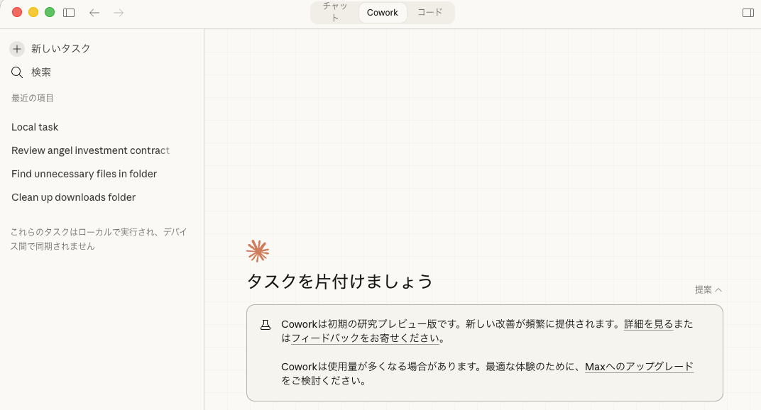 2. Claude アプリを開き Cowork の画面に遷移