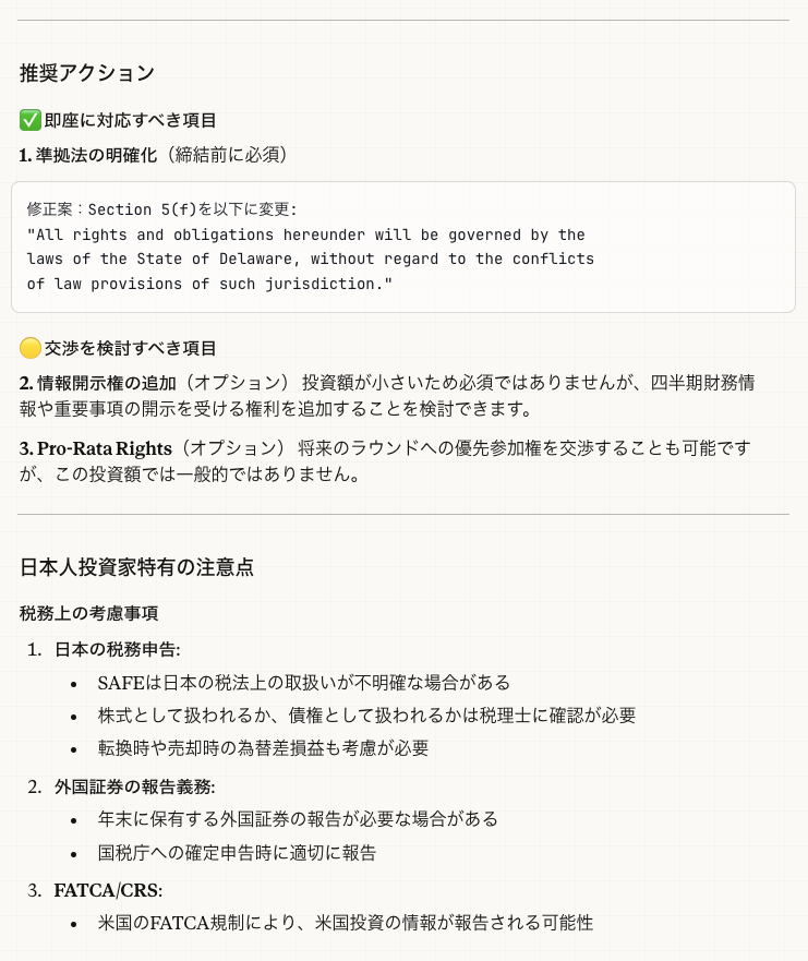 - 条項ごとのリスク評価:各条項について投資家側のリスクをGREEN/YELLOW/REDで分類