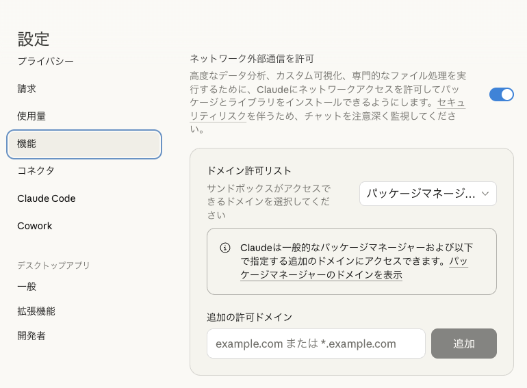 設定画面で外部ネットワーク通信を許可する。パッケージマネージャへのアクセスのみに制限するのが推奨。